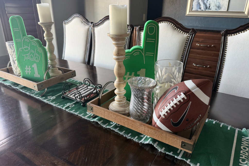 For the dining tables, I keep the base layers neutral and swap out only the accent pieces. It’s all about layering — woven table runners, leather footballs, glass candles, wooden candlesticks, and deep green tones. Since we use both dining rooms regularly (and during the event), I want the spaces to stay functional as well as beautiful.